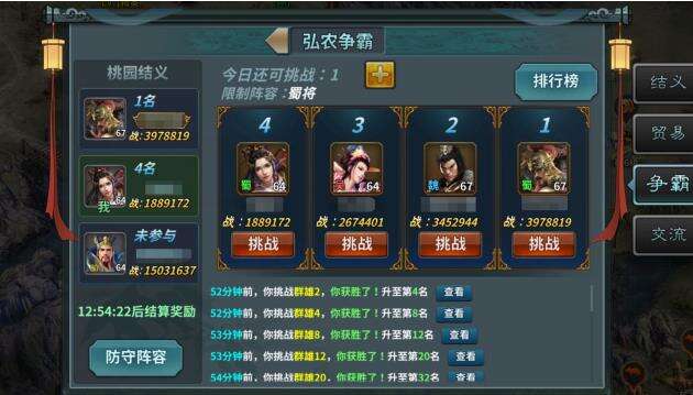 C.争霸,可设置防守阵容,挑战更高的排名,根据结义中所有人的排名每日可获得元宝等奖励。