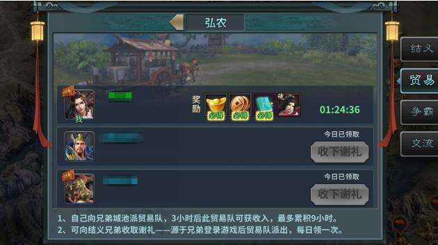 B.贸易,每3小时可获取一次收益,储存上限9小时;收下谢礼等操作(每日可获取大量的元宝与其他资源)