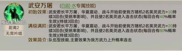 比如:白起(水),自带的(武安万屠)就只能与自带连携技能的英灵搭配,并且白起(水)组成的队伍能很大程度的克制依靠主动输出的队伍。