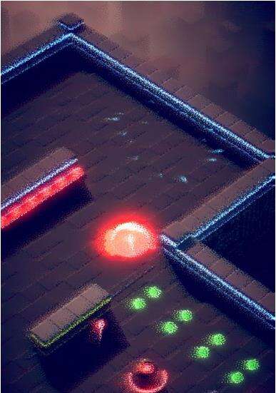 这张上那个带锯齿的为一个陷阱(叫它电锯好了。)碰撞它将会死亡,其拥有墙壁等同的不可穿越性质。电锯移动沿着地面上的轨迹线,方向与速度固定。左面红色的多面体与之前的地图边缘基本一致。右边为一个旋转激光炮台•最弱型,只会固定方向和转速,固定长度激光,找好角度从后面撞上去就行了。