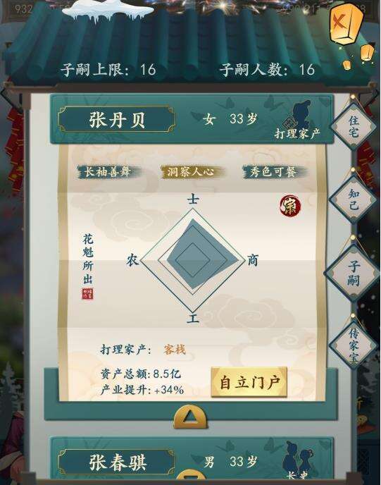 先说子嗣 想玩钱庄高商属性的子嗣是必备的 那么多高算及格呢 给大家看2张图