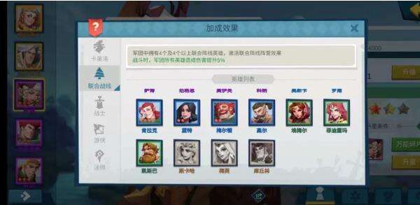 联合战线:同上,激活联合战线阵营效果,战斗时,军团所有英雄造成伤