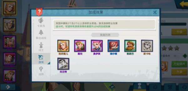 游侠:游侠职业效果,2个及2个以上激活。战斗时,军团中所有游侠获得伤害提升15%加成效果。