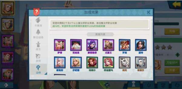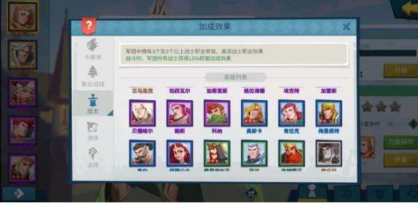 战士:战士职业效果,3个及3个以上激活。战斗时,军团所有战士获得15%防御加成效果。
