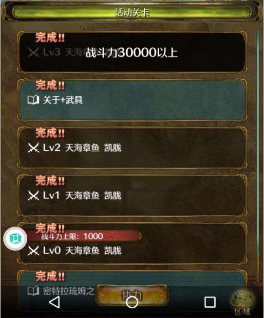 然后按部就班的往上把lv1和2都打了,怪物本身也会掉活动防具,尽量多刷刷把所有防具和饰品都突破到70。因为绿豆(种子)目前获取非常困难,尽量先冲防具等级,升级防具的蓝色种子可以在每日任务那里炸(章)鱼获取。为了利用有限的资源,先把所有装备强化到50级,然后突破到55级,以此类推一直强化到70,在辅助栏全开的状态下到达3万战力并不难