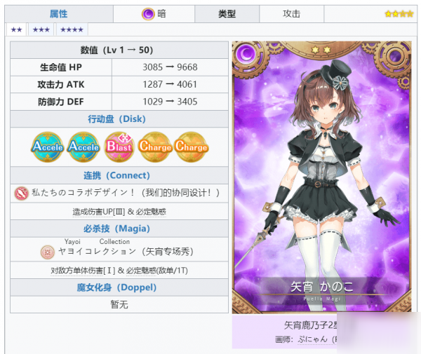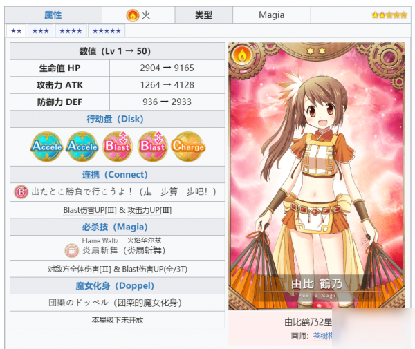 盘型为AABBC,连协和Magic都走极致暴力输出,自己是Magia型卡,本身回复魔力的速度就很快,加上Magia有必定回避。技能组上相当优秀,伤害也十分爆炸,属于必练的二星角色。