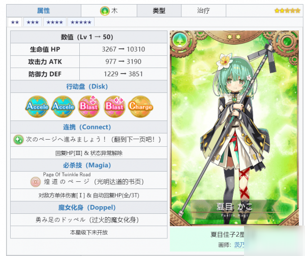 木属性治疗型,盘型AABBC中规中矩,既能状态解除又能回血的奶妈,能解除控场效果的属性优秀性能,如果开局没小圆的情况下,夏目可说是对萌新十分友好的卡。如果有余力,十分推荐练卡,毕竟这个优秀的Connect也就只有圆神和圣麻美了有了。