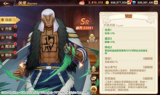 阵容的防御,由怒攻必定会对敌方直线伙伴施加[沮丧]的首脑来担任,因为[沮丧]状态的对手对他造成的伤害会降低。并且首脑升到三星之后,他的普攻会有吸血效果,作为防御续航型伙伴他的能力无疑是很不错的。