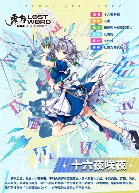 十六夜咲夜:“初次见面,我是十六夜咲夜。平时负责侍奉红魔馆主人蕾米莉亚大小姐。小到煮饭、打扫、洗衣、退治妖怪,大到解决异变,有什么我可以帮得上忙的地方请不必客气,尽管提吧。毕竟别看我这样,我好歹还是人称“完美潇洒的女仆”的,对于我的本事您大可不必担心。”