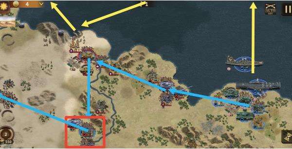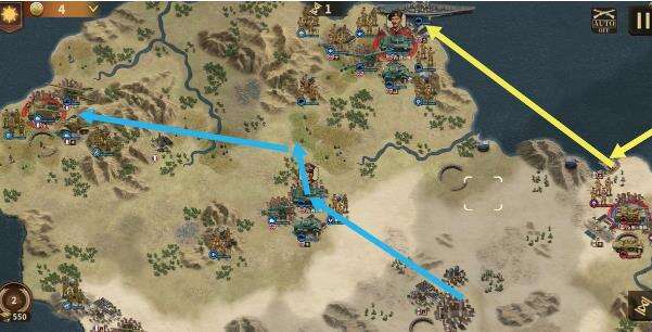 击杀博克后再继续向最左侧红圈城进发,期间注意使用伞兵偷城与屯经济。