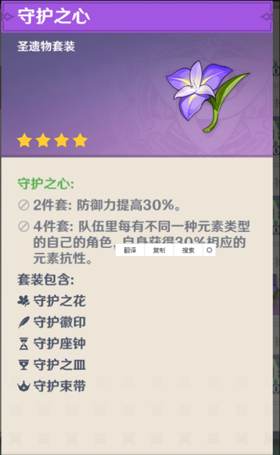 同时四件岩套的内置冷却时间是不存在的,我们能够非常轻松的切换到不同属性的提升,如果没有合适的四件套就可以选择岩与守护的2+2组合,守护两件套能够提供阿贝多百分比的防御能力。不过守护装备的位置则是要选到羽毛和花上面,众所周知四星圣遗物的属性是没有五星高的,所以这两个固定的属性位置就给到了守护。