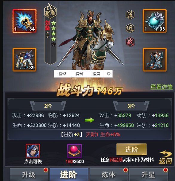 武将在一开始的进阶只需要使用进阶丹即可,不过后面的话就需要我们携带上同一个品质的角色在加上进阶丹才能够完成进阶,用此方法进阶以后不仅拥有更多的属性还可以帮助角色拥有最新的天赋,让整体实力变的更强。