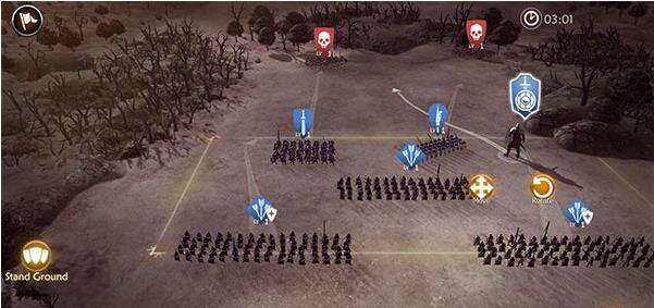 准备好士兵之后就要开战了,虽然关于战斗的部分是这款游戏的弱点,特别是普通士兵相互搏杀的场景根本无法直视。战斗的操作比较简单,选择兵团然后拖动他们,根据不同兵种之间相克的道理布置好每种兵团的位置后,点Fight就开打了。
