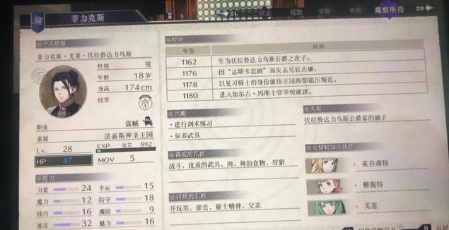 菲力克斯的才能绽放是理学,绽放后是黑魔法必杀+10,自身擅长剑术、弓术、格斗术,不擅长理学和指挥(才能绽放后就一个指挥)。可学会战技:一刀两断、秘剑、强弓、踏步连击、魔法强打,指挥可学会埋伏之阵。理学:雷电、拖隆,信仰:圣疗、休息。