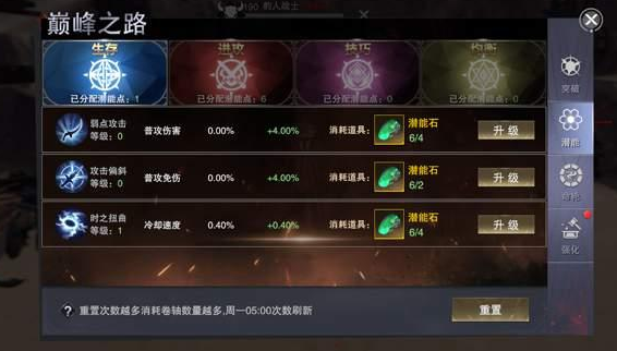首先,开启巅峰等级最直观的就是生命值和攻击力的提升,提升巅峰等级还可以解锁全新的技能、装备以及提升原技能的百分比伤害。同时,巅峰突破还可获得潜能石,用来升级潜能天赋。接下来,我将针对巅峰等级的提升、潜能天赋的搭配以及装备选择等方面。