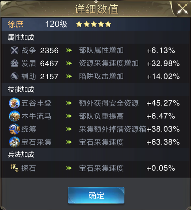 这个技能还是比较简单的,就是在地图上采集的时候,无论采集的是农田、伐木场、铁矿场还是宝石矿场,都可以在采集结束的时候多获取一定比例的安全资源。这里的四种资源不包括金币,也不包括盟矿。