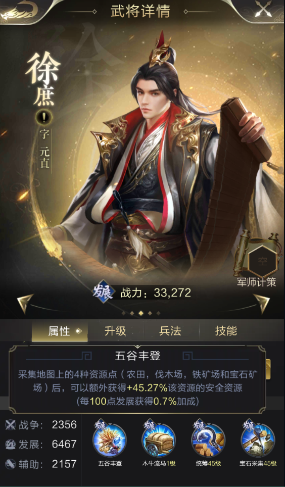 徐庶专属技能【五谷丰登】,可以在采集地图上的四种资源点后,额外获取一定比例的安全资源。该技能的效果受到武将发展属性的影响,满发展属性6467时,可以额外获取45.27%的安全资源。