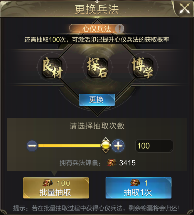 采集武将理论上需要学习4种采集技能。但考虑到我们可以自主选择采集哪一类的资源矿。让所有采集队列采集同一种矿产可以节省大量的技能丹,收益会更高一些,可以只学习1种资源采集类技能,比如前期学习【木材采集】发育王城,后期学习【宝石采集】来多采宝石点科技,然后学习【统筹】增加收益,最后一个技能格的根据需要学习【木牛流马】增加负重或者在学一个常用的采集类技能。