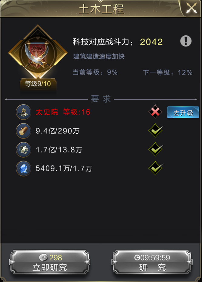 确定了冲击王城的目标,下一步当然就是要提升升级王城的效率。前期主要通过君主天赋技能和科技来提升建筑速度。
