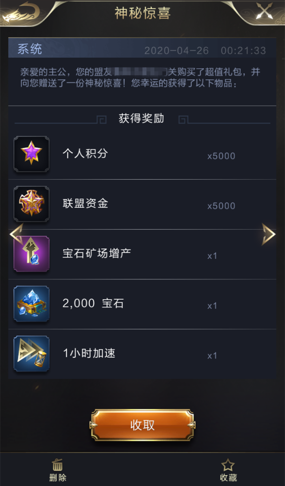 购买礼包时,可以给盟友送出一份“神秘惊喜”,可能包含加速、资源和一些道具,对冲堡有很大的帮助,同时获取的联盟资金和个人积分,也可以在联盟兑换加速或其他道具。