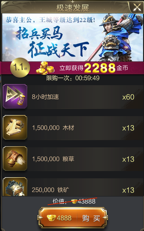 简单介绍一下性价比,升城礼包不止有海量的资源,就只算加速价格当资源是搭头,平均1小时加速大约10.2元宝左右,性价比也要比船上和普通触发的礼包更高一些。缺点是这些礼包都是一次性的,如果想要让自己冲堡速度更快一点,可以算一下其他礼包的性价比,一般临时触发的礼包或者活动的礼包性价比会更高一些。