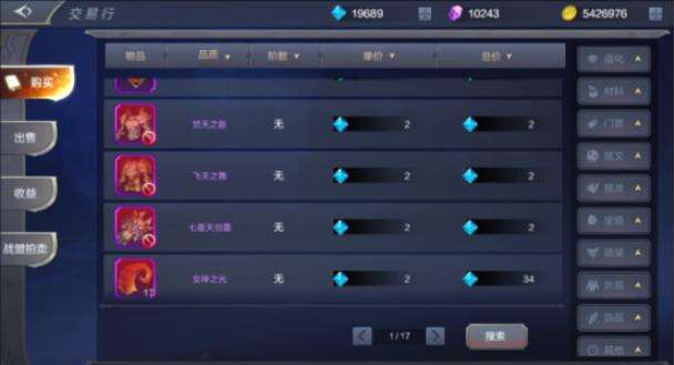交易行物品多种类型,从装备、药水、奥义、材料、门票、强化、铭文、精灵、坐骑、骑装、外观等等,可以说是应有尽有。给出一个的“淘宝”建议是只购买自己最需要的物品,这个建议与上述内容中提到的一个点有很大的关联——按个人培养策略的侧重点去取舍。假设你目前的目标是转职,那么你最需要买的就是转职的道具,而不是随便去买其他材料。
