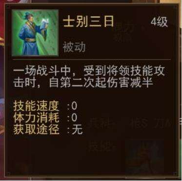 吕蒙技能“士别三日”将原本一场战斗中,第二次受到相同武将技能攻击时,收到的伤害减半,调整为一场战斗中,受到将领技能攻击时,自第二次起伤害减半,收到的伤害减少,坦度进一步提高。