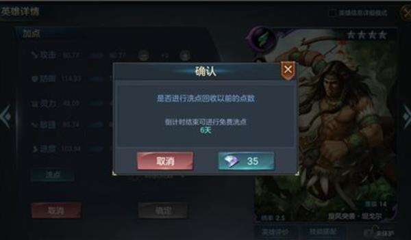 3、洗点:英雄加点加错了没有关系,我们可以通过点击配点来重新洗点,每7天有一次免费的机会,如果7天内再次洗点,则消耗35钻石。