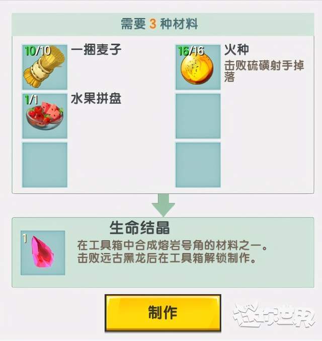 第一步,我们按照他指示的步骤先使用工作箱制作生命结晶,我们需要准备好麦子10捆,1个水果拼盘以及16个火种,不知道是不是地心之神喜欢吃水果拼盘还是什么别的原因,小编实在想不明白为什么要加入水果拼盘。
