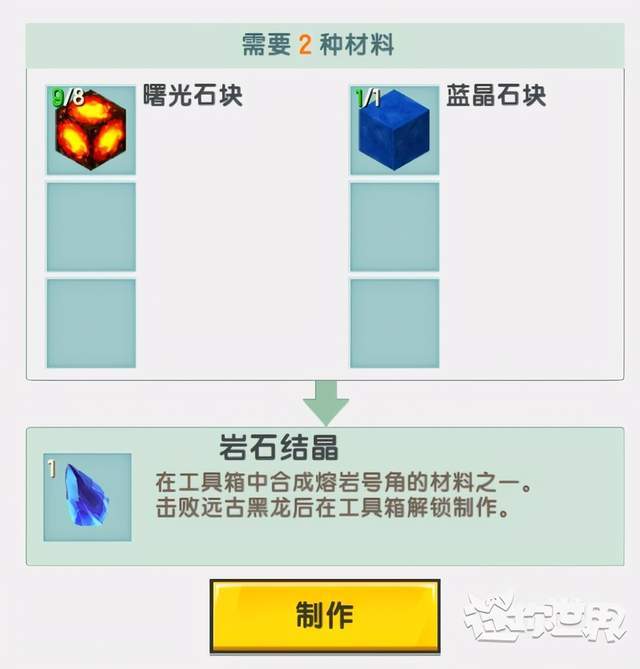 制作完生命结晶后,继续按照他指示的做,毕竟我们也没有什么别的线索,下一步就是制造岩石结晶了,而制作岩石结晶所需要的材料就相对生命结晶来说要较为珍贵了,需要8个曙光石块和1个蓝晶石块才能做出我们需要的岩石结晶来,但我相信这并不能难道我们充满冒险精神的小伙伴们!