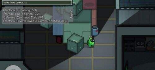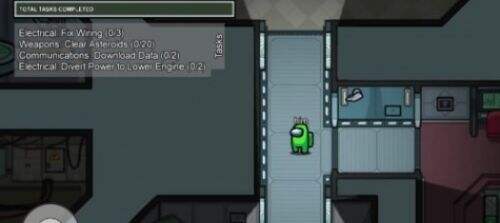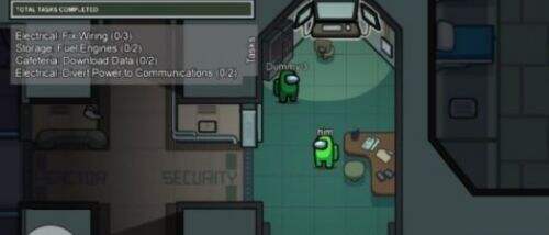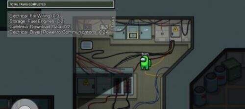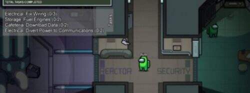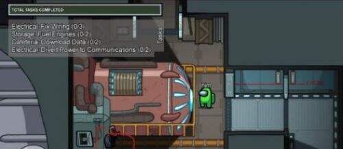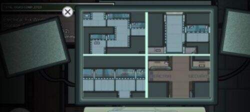 这里是地图中心的一个点位,且大部分人在这里有任务,所以说这里往往聚集着多个人,因此命案发生率相对较低,且命案发生后容易被发现。左下角有井盖,可通往餐厅和导航室门口。中间桌子的左边是热感应图(又称天眼),可显示地图上各个位置的人数(e.g. 图中管理室有两人,监控室有一人……)。右上角是氧气紧急任务的修复点之一(后面讲)。