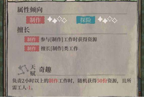 吴承恩的天赋是在负责2小时以上的制作时,能获得50/70/100份随机的资源,并且工人需求减少1/2/3(数字按等级提升)。那么配合上面的属性来看,其实吴承恩的属性和天赋都不是特别的出挑的,只是开荒的时候能随机获取资源还可以,到后期的话略有一些普普通通。