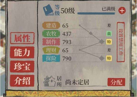 吴承恩擅长的工作是【制造】,50级满级属性可以参考下图:制作和探险特级,农牧良,建造和理财是差。