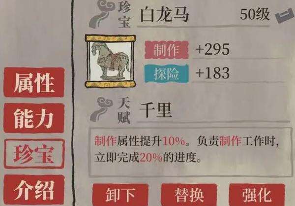 关于专属珍宝,官方为吴承恩配置的专属珍宝是“白龙马”,属性加制作和探险,提升制作属性并立即完成制作进度,弥补了吴承恩制作时间方面的缺憾,还是比较搭配的一个珍宝。如果没有抽到的话,像缚龙索这种制造属性高的珍宝也都是可以用的,加制造属性的、减制造时间的,都可以用。