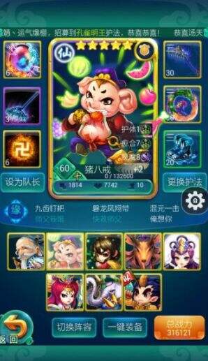 二号位八戒,这是一张全民神卡,试炼荡妖推图样样行。我开始时讲过拼血的中心思想就是减对面攻,加自己血来建立优势,拼血胜利。但是,七图精英是一个难度很高的图,我想小伙伴们在尝试拼血荡七图时一定遇到过这种问题。本方护法没有死,鹿力也一回合送死了,但是最后拼血就是拼不过,拼血失败就是团灭,就是16元宝啊。我摸索阶段也遇到这个问题,原因是七图npc血量太高了,后排三清攻击也变态,自己润泽加的血上限不一定能保证拼血成功。金猪正好完美解决这个问题,加了血上限的金猪,疯魔成长简直吓人,攻击很快到达五六千。这样十回合下来金猪能敲死一两个对位npc,天赋和混元一击也能很好的去对面血量,这样最后拼血就很稳了。小伙伴们会看到我图中金猪没有带乱棍,因为乱棍是不稳定因素。如果乱棍敲死三个,对面三清同时入阵,对不起,这样基本要团灭了。我们只需要金猪一下一下敲死一两个对位的npc就够了,足够保证最后拼血胜利。切记,金猪不要带乱棍。