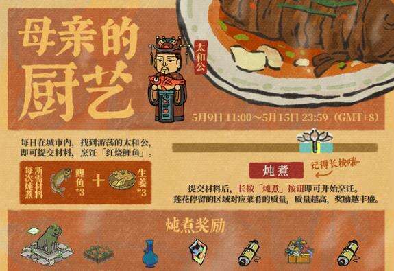 每日在城市内,找到游荡的太和公,即可提交材料,烹饪「红烧鲤鱼」。