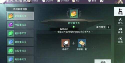我们需要消耗一定的元宝以及铜钱进行锻造,这样有一定的概率获取到一星至四星的随机奉天玉,奉天玉拥有自己的基础属性以及一些随机的属性。