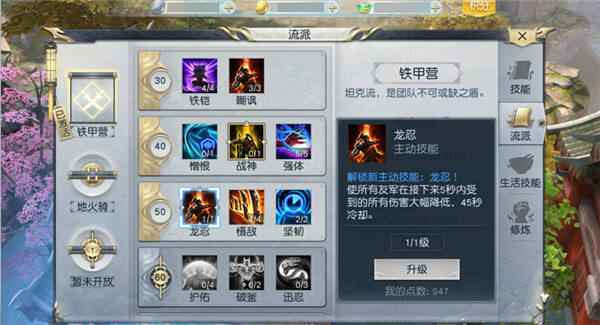 目前龙将开放了两个流派:铁甲营、地火骑,分别对应了坦克流打法以及攻击流打法。下面来看一下龙将的流派技能都有什么吧: