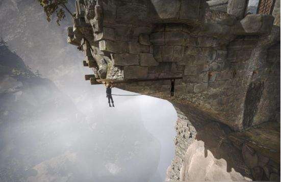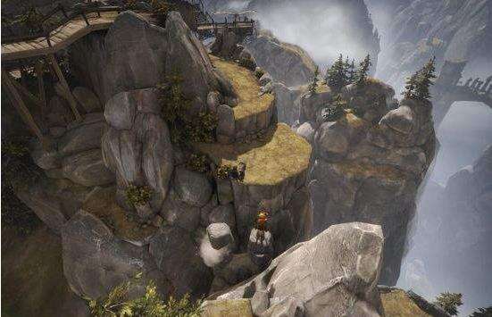 二.走过独木桥背靠岩石通过悬崖后,发现一个巨大城堡,接着看到一个比较大的间隙,兄弟两人跳不过去,没办法只能往下走,看到一个羊圈,骑上两批山羊之后,就可以通过间隙了。接着沿着路走下去,有个到有一家滑翔机的地方,有一个博士叫兄弟二人帮他装下升降机的齿轮,接着就把齿轮扔了过来(抱着齿轮的人没办法过独木桥或是跳跃,要先扔到对面去),转动把手后,升降机上升。之后问博士借滑翔机。