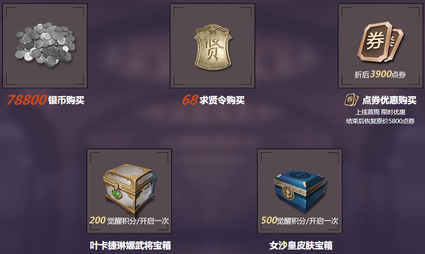 叶卡捷琳娜在游戏内的售价为78800银币,68求贤令,首周点卷价为3900点卷,恢复原价后为5800点卷,武将宝箱为200积分一次,皮肤宝箱为500积分一次,当然也可以选择五连抽,到底是欧皇还是非酋,祝你好运!