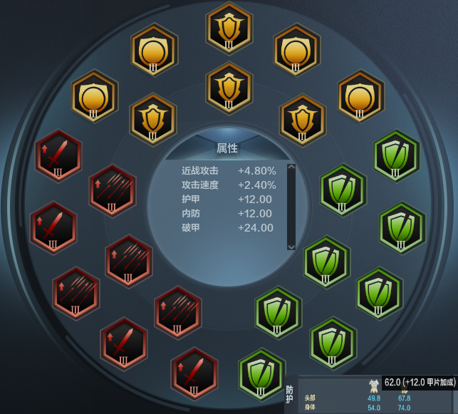 防御方面,制式铁铠:内防62外防42,两项数据与邓艾及忍者的相同,62的内防为51位武将中最高的,当然忍者和邓艾的内防也是并列第一的,如图,那内防主要防的是砍伤与钝伤,骑兵混战或者进行趟阵所受伤害多为砍伤,所以他的混战能力还是不容小觑的。