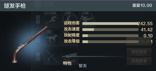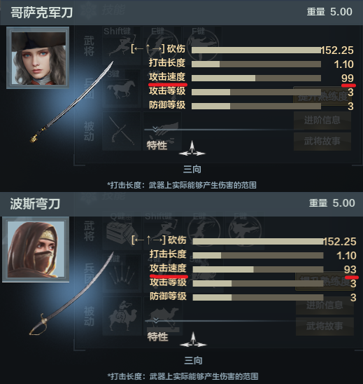 那么叶卡捷琳娜的军团,俄罗斯骠(piao)骑兵,骠骑兵主要武器是马刀,擅长利用速度突击对方防线,也执行侦查或搜索等任务,性质上属于轻骑兵。我们可以看到军团定位是游走轻骑,特长是机动射击掠夺物资,部队人数为20人,这与游戏里其他轻骑兵人数相同。下面我们来看装备:主武器为哥萨克军刀,为上左右三项武器,砍伤可以达到152.25,打击长度1.1米,99的攻速,攻防等级皆为3级。3级的防御等级说明下格挡可以抵挡像杰拉德这样的架枪,不俗的伤害和长度那我就想到了西贝拉的副武器,与这款武器的砍伤与打击长度及攻防等级都相同,唯一不同的就在于攻速,这也是他的特色,高攻速足以让他在混战中尽情发挥。副武器燧发手枪,远程伤害242.55,伤害不俗,攻速较慢为41.42,精度0.1为最高,游戏中有1发载弹与7发备弹。