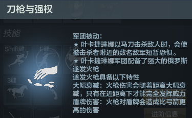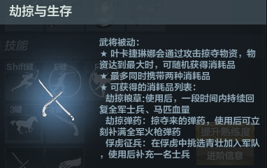 下来我们来看被动技能,武将的被动劫掠与生存,叶卡捷琳娜通过攻击掠夺物资,物资达到最大时,物资值为100%最大,可与通过攻击和时间来恢复,与其他武将类似。满值时会自动随机从以下三种消耗品中获得一种,要知道消耗品相同是可以叠加的,使用的键位就是5键与6键,根据获得顺序排列。这三种消耗品分别为劫掠粮草,劫掠弹药,俘虏征兵。粮草,顾名思义,可以回血,使用后,一段时间内持续回复全军士兵、马匹血量,这与赵云的休整技能相似,人和马都会回血,混战和待命期间回复全军血量作用明显;弹药,自然是用来补充火枪子弹的,使用后会立刻补满全军火枪弹药,要注意的是,主将只会补充7发弹药;俘虏征兵,会在俘虏中挑选青壮加入军队,使用后补充一名士兵,在游戏中每次会获得两个该道具,有人会问俘虏在哪,俘虏随物资而来(得有人来运输啊,手动滑稽),各位看官就不必追究了。再来看军团被动,刀枪与强权:叶卡捷琳娜用马刀击杀敌人时会使被击杀者附近的数名敌军短暂恐惧,有么有想到,霸王项羽和张翼德的恐惧效果。要注意的是叶卡捷琳娜击杀敌人才可以触发,恐惧的注定是小兵,对主将无效。这点也是混战中很有用的效果哦。叶卡捷琳娜的军团配备了强大的俄罗斯燧发火枪,燧发火枪具备以下特性,大幅衰减:火枪伤害会随着距离大幅衰减,只有在近距离下才能完全发挥威力。盾牌伤害:火枪对盾牌会造成比弓箭更高的伤害。就是说明一下小兵也有火枪,火枪有两个特性,一个就是要近距离伤害最大化,另一个就是打盾比弓箭打的快,目前子弹打盾上的音效是piu~的一声,像是金属球被金属弹开的声音一样。