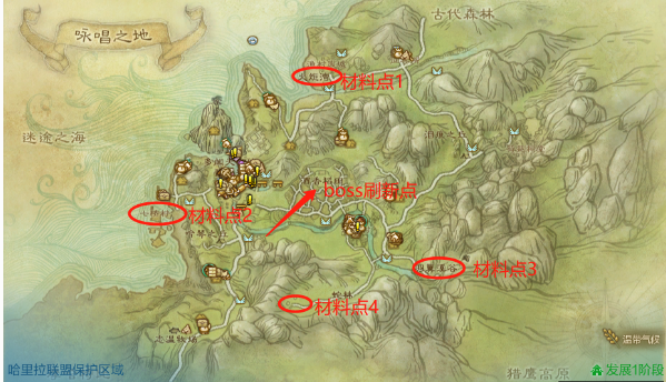 (材料134为击杀小boss点,2为可收集酒点,材料点4小boss刷新时间为6小时,重点为蹲此小boss)