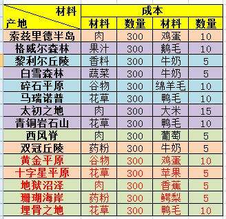 下面上西大陆特产制作材料图和可获取绑金数量。