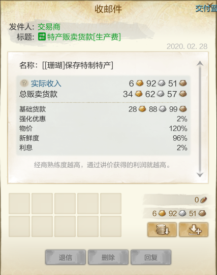 制作不同的特产会消耗不同的劳动力与绑金,制作特产之后无论是谁交付制作者都将获取20%的制作生产费,交付者获取80%的运输费。