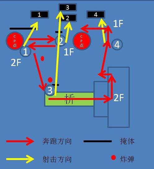 5. 顺着图上路线来到地点3,这里也有掩体,狙击箱子3,不过距离是最远的,所以比较考验技术。假如之前跑得快,桥上没有敌人,可以放心狙击。之后就顺着图上路线过桥,通过2F的房子,来到有几个敌人蹲守的那个平台,找到西北角的缺口跳下去。这里有一定几率四眼会坠桥,不用管他。