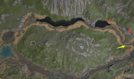 黄色地方是楼主选择的发育地。这个地方虽然有些大型食肉龙但是都比较容易依靠附近的梁龙或者其他食草龙摆脱。红色箭头标注的是3个红光降落的地点稳妥的人可以不去左边第一个的光。中间的红光和右侧的光都比较安全,一个在山上一个在山谷中。