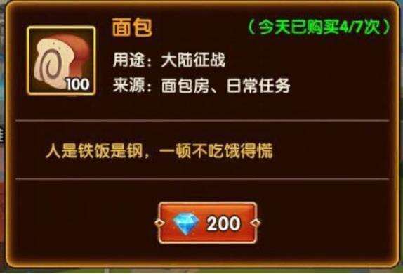 其一是买面包(体力) 面包关系到你的等级 英雄的培养 但同样也有限度 不管你每天能购买几次面包 我这里建议是每天买到200钻石/100面包就停下来 因为再往后买就是土豪行为了 虽然体力真的很重要 但毕竟我们作为平民玩家 要理性消费!