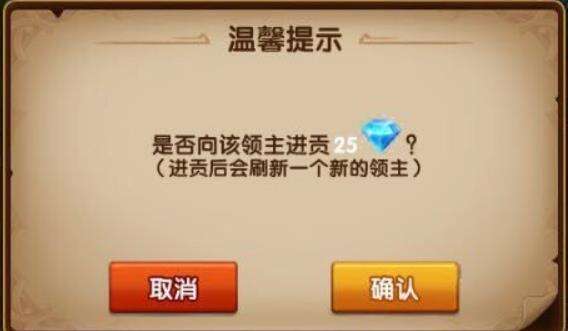 那么这里有个纳贡的设置 这里提示大家千万不要点确认 因为纳贡之后 刷新的领主依然强大!所以完不成是常有的事情